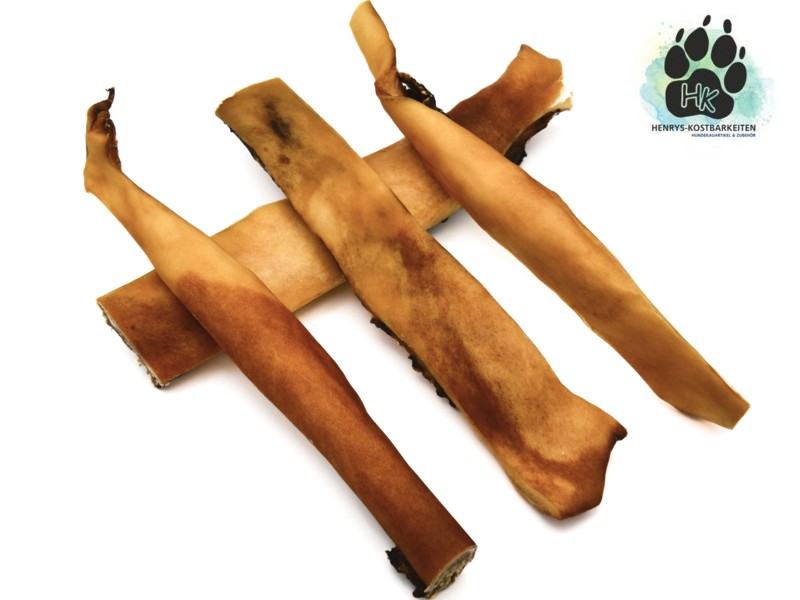 Rinderkopfhaut ein langer, fester und harter Hundekauartikel für kleine energische Kauer oder für mittlere und große Hunde.